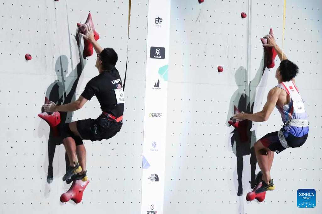 Li Xu (R) of China competes against Michael Hom of the United States during the men's speed round of 16 race at the IFSC Climbing World Championships Seoul 2025 in Seoul, South Korea, Sept. 25, 2025. (Xinhua/Yao Qilin)