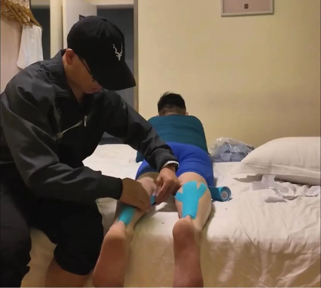 A running companion supports a participant in relaxing before a marathon. (Photo from Qianjiang Evening News)