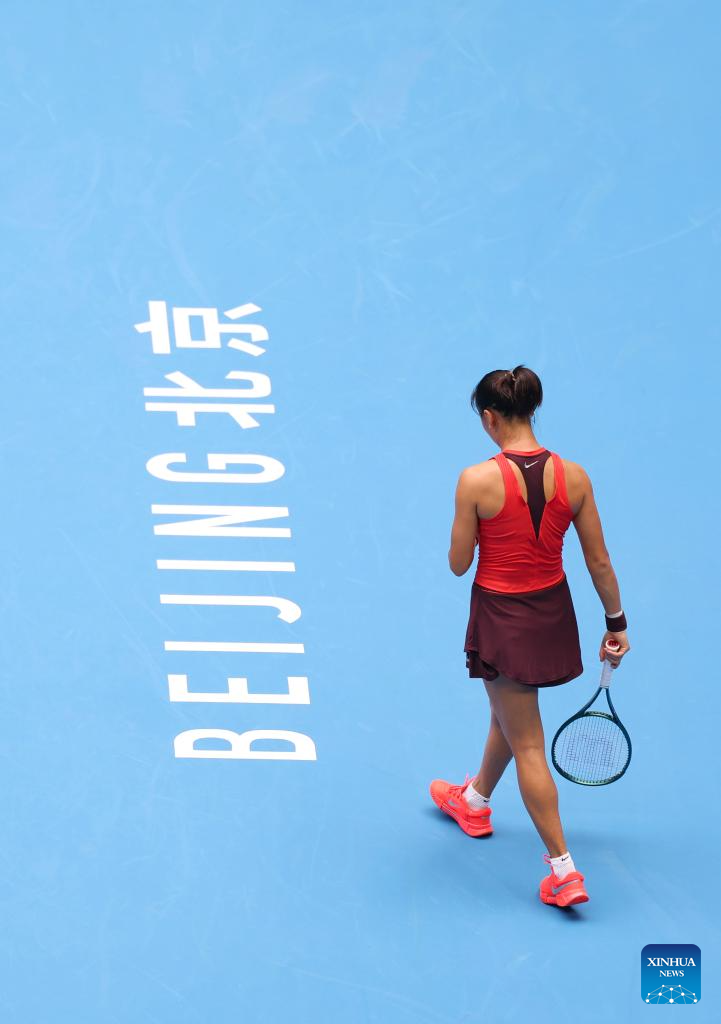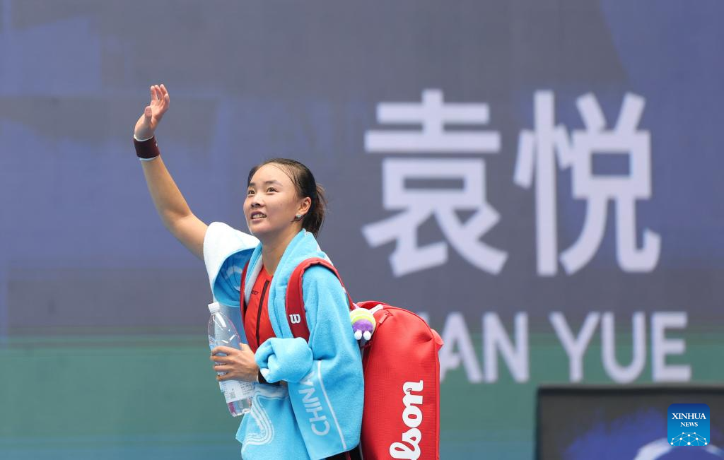 Yuan Yue of China greets the spectators after the women's singles second round match against Iga Swiatek of Poland at 2025 China Open tennis tournament in Beijing, China, Sept. 27, 2025. (Xinhua/Bai xuefei)