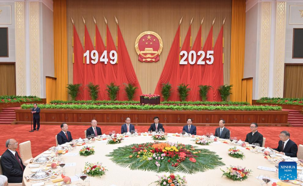 Wang Huning, a member of the Standing Committee of the Political Bureau of the Communist Party of China (CPC) Central Committee and chairman of the National Committee of the Chinese People's Political Consultative Conference (CPPCC), attends a reception to celebrate the upcoming 76th anniversary of the founding of the People's Republic of China, in Beijing, capital of China, Sept. 28, 2025. (Xinhua/Gao Jie)