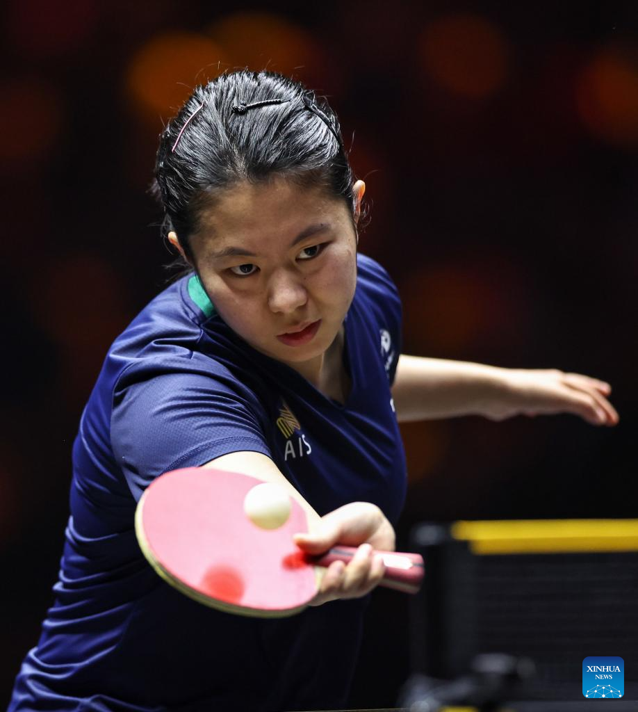 Liu Yangzi hits a return during the women's singles first round match between Wang Yidi of China and Liu Yangzi of Australia at the 2025 World Table Tennis (WTT) China Smash in Beijing, China, Sept. 28, 2025. (Xinhua/Wang Kaiyan)