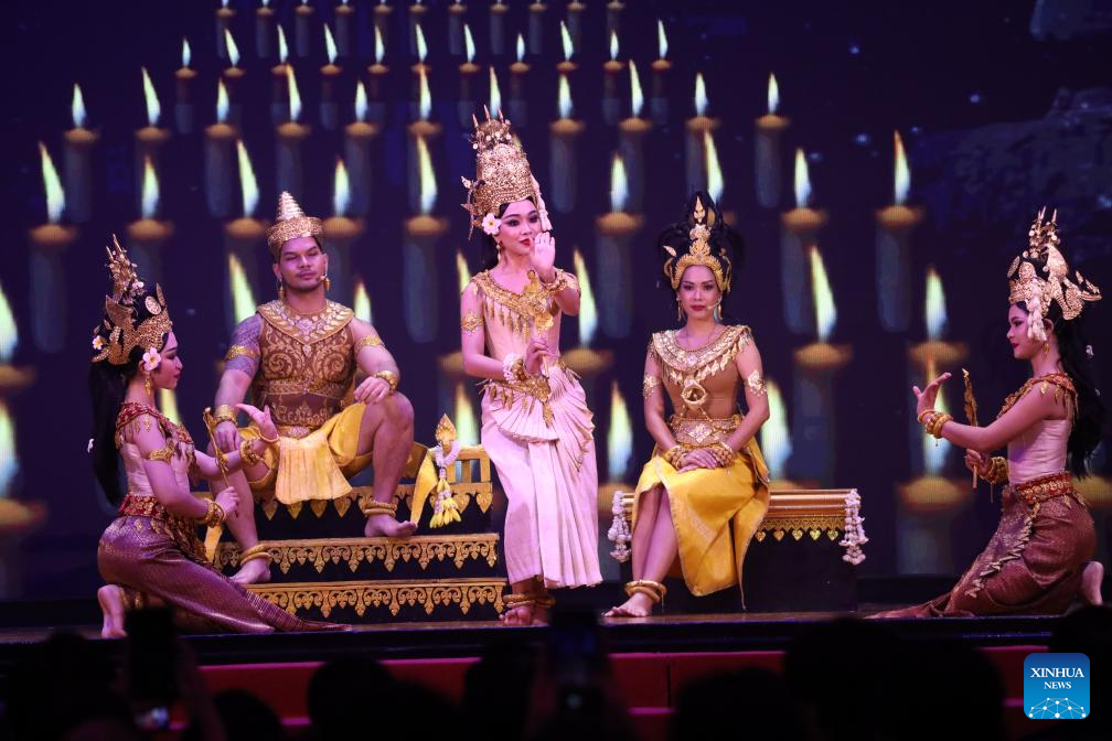 Cambodian artists perform at the 2025 China-Cambodia mid-autumn festival friendship gala in Phnom Penh, Cambodia on Sept. 28, 2025. The gala held here on Sunday evening attracted hundreds of revelers. (Photo by Nitola/Xinhua)