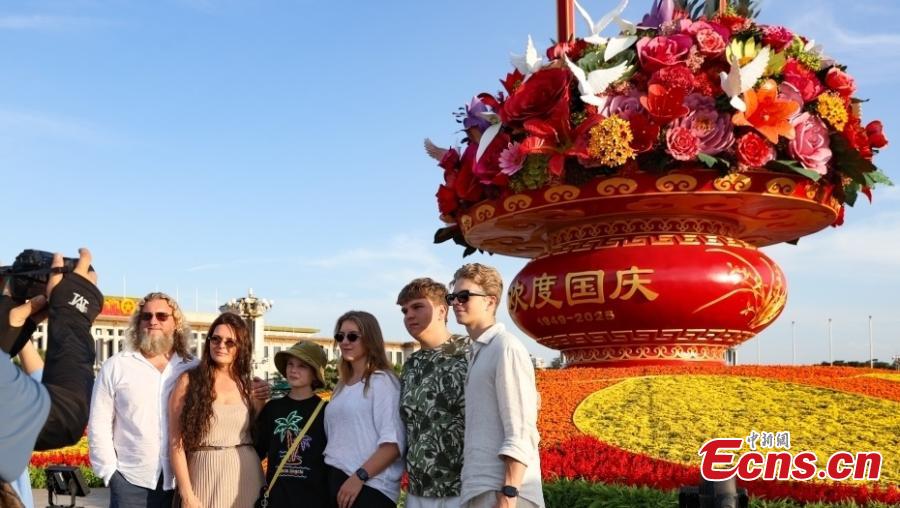 Visitors pose for pictures in front of a flower basket at Tiananmen Square in Beijing on Sept. 28, 2025. (Photo: China News Service/Yang Yuran)