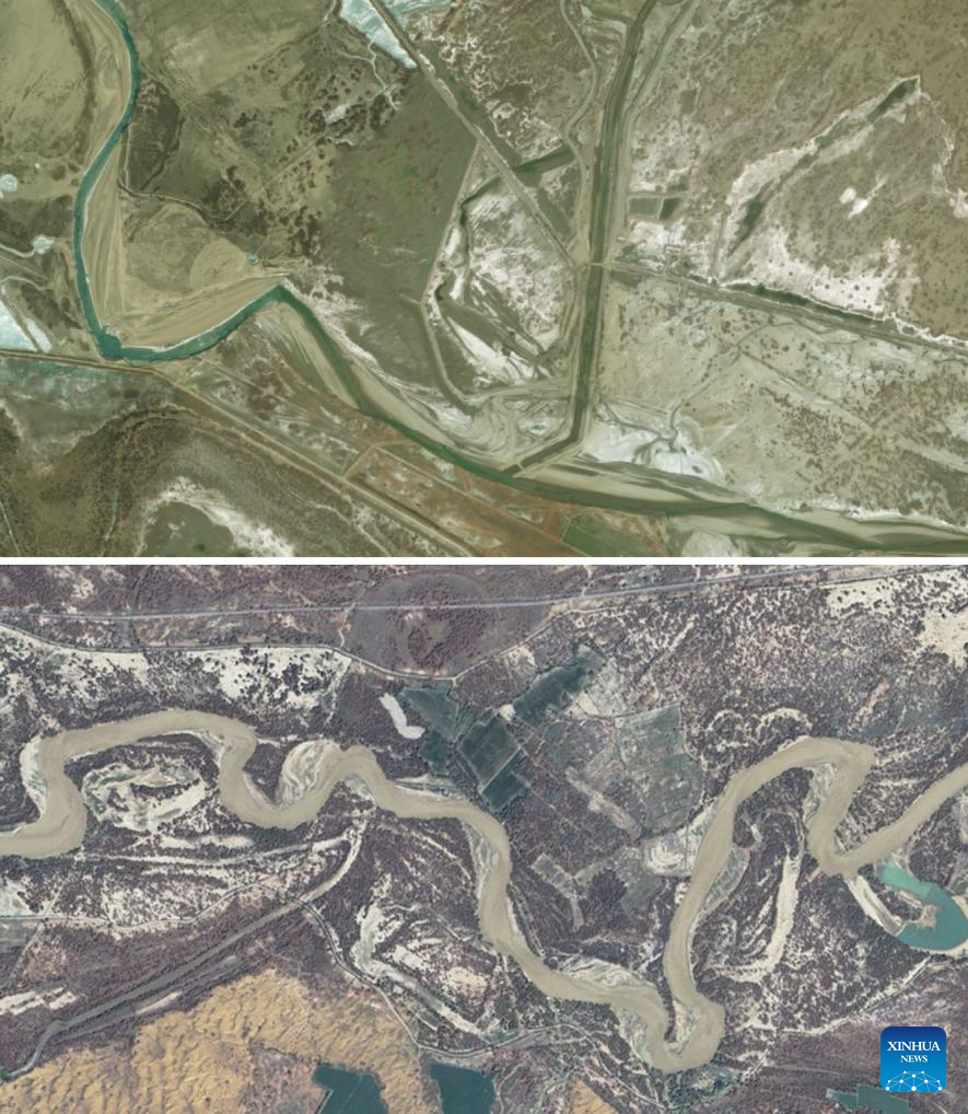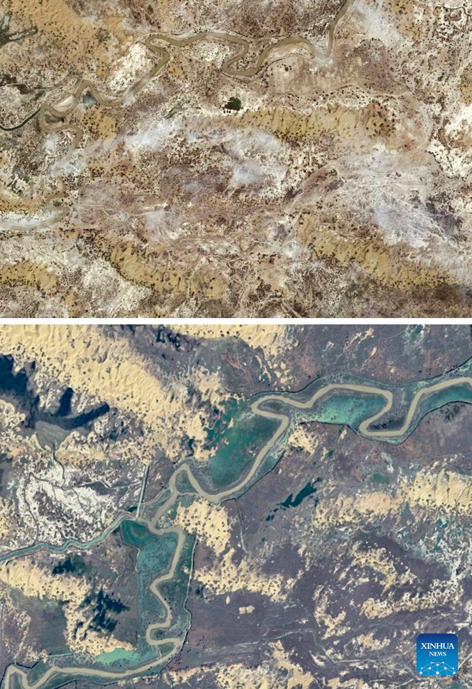 This combo photo shows the satellite images of the Wusiman River and its surrounding areas taken on Aug. 14, 2010 (above) and on Aug. 8, 2024 (below) in Yuli County, Mongolian Autonomous Prefecture of Bayingolin, northwest China's Xinjiang Uygur Autonomous Region. (Xinhua)