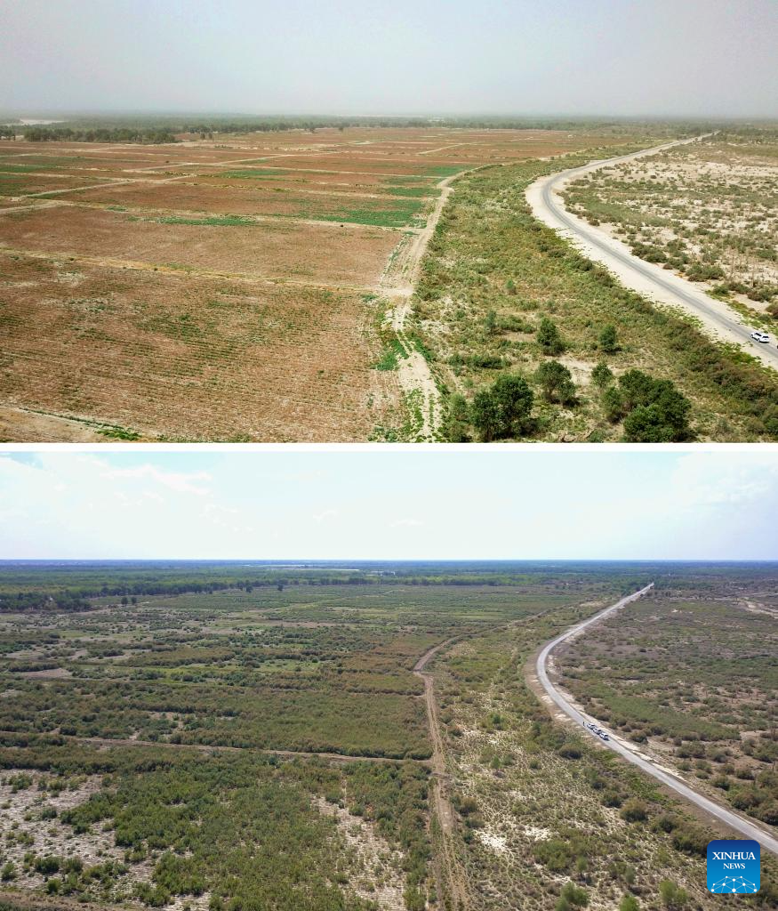 This combo photo shows the aerial view of a populus euphratica forest reserve near the Tarim River on July 24, 2017 (above), and the same area in July 2025 (below) in northwest China's Xinjiang Uygur Autonomous Region. (Xinhua)