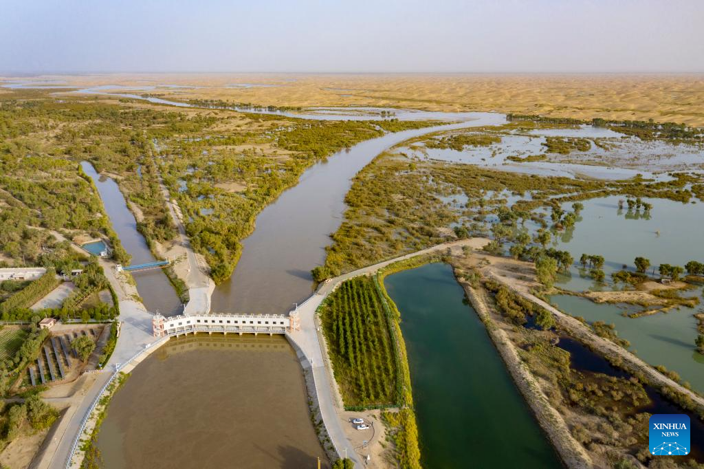 An aerial drone photo taken on Sept. 20, 2025 shows a view of the Tarim River and an estuary water diversion hub in Yuli County, Mongolian Autonomous Prefecture of Bayingolin, northwest China's Xinjiang Uygur Autonomous Region.(Xinhua/Chen Shuo)
