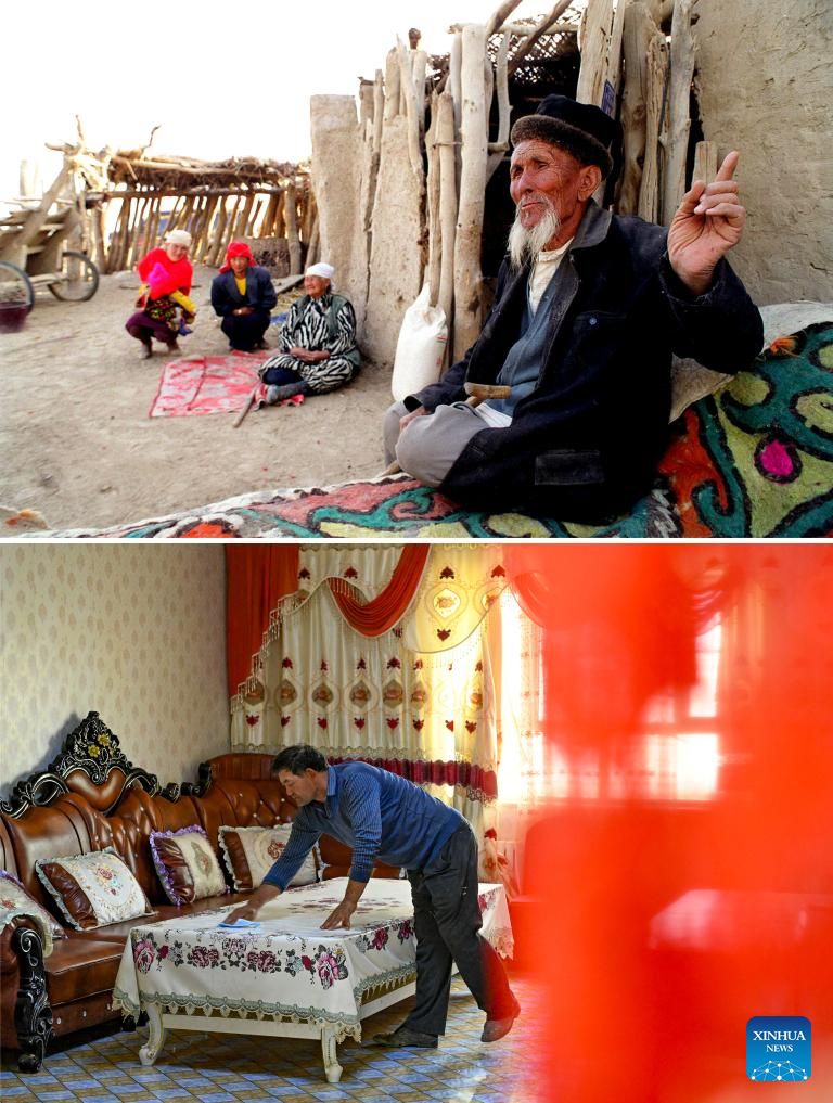 This combo photo shows villagers resting outside their clod residences (above, photo taken in 1999 by Xinhua photographer Shen Qiao) and a villager doing cleaning at his house (below, photo taken on Sept. 20, 2025 by Xinhua photographer Chen Shuo) in Karquga Township of Yuli County, Mongolian Autonomous Prefecture of Bayingolin, northwest China's Xinjiang Uygur Autonomous Region. (Xinhua)