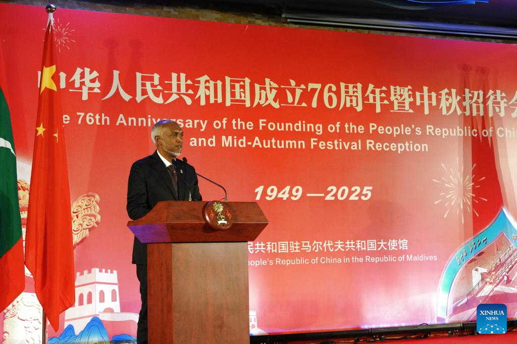 Maldivian President Mohamed Muizzu delivers a speech while attending a reception marking the 76th anniversary of the founding of the People's Republic of China and the Mid-Autumn Festival, hosted by the Chinese Embassy in the Maldives, in Male, Maldives, Sept. 30, 2025. TO GO WITH "Maldives ready to deepen cooperation with China for prosperous future: president" (Xinhua/Wu Yue)