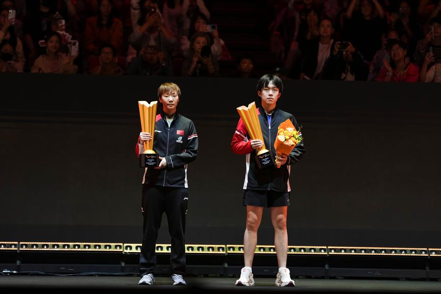 Winners Wang Chuqin (R) and Wang Manyu pose during the award ceremony at 2025 World Table Tennis (WTT) China Smash in Beijing, China, Oct. 5, 2025. (Xinhua/Sun Fei)