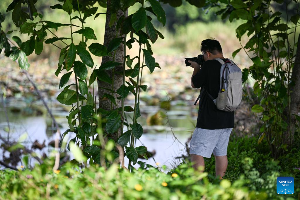 A tourist takes photos at the Haiwei National Wetland Park in Changjiang Li Autonomous County, south China's Hainan Province, Oct. 3, 2025. Following ecological restoration and facility construction, Haiwei National Wetland Park has recently reopened to the public. The park serves as a crucial habitat for migratory birds.