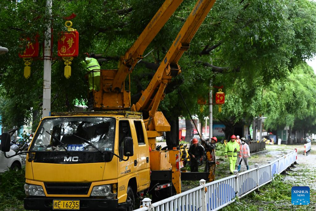 Workers clear up fallen tress in Beihai, south China's Guangxi Zhuang Autonomous Region, Oct. 6, 2025. Typhoon Matmo, the 21st named storm of the 2025 Pacific typhoon season, made landfall along the coast of Guangxi on Monday, bringing strong winds and heavy rainfall. (Photo by Li Junguang/Xinhua)