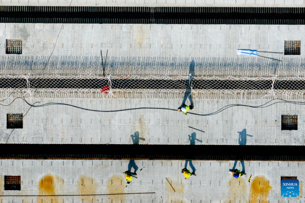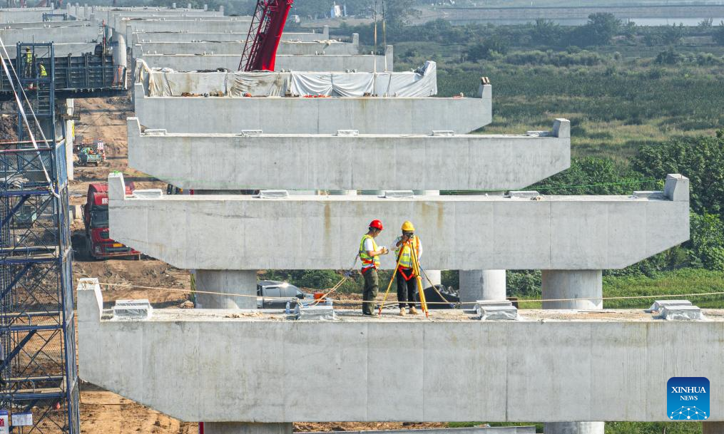 Constructors work at the construction site of a highway in Wuhan, central China's Hubei Province, Oct. 6, 2025. Many workers have been standing fast at their posts and fulfilling their duties during the eight-day National Day and Mid-Autumn Festival holiday. (Xinhua/Xiao Yijiu)