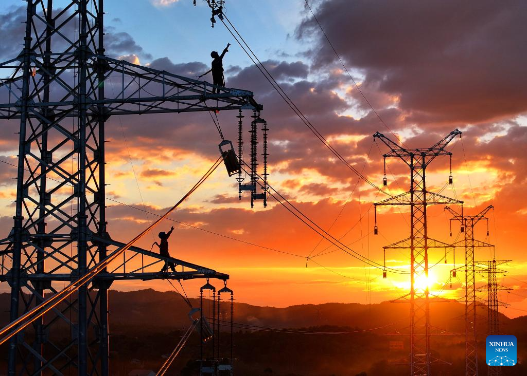 A drone photo taken on Oct. 6, 2025 shows workers carrying out cable installation work on a high tower in Hengyang, central China's Hunan Province. Many workers have been standing fast at their posts and fulfilling their duties during the eight-day National Day and Mid-Autumn Festival holiday. (Photo by Cao Zhengping/Xinhua)