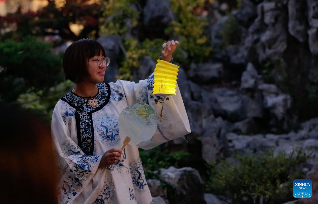 A teenage girl holds a lantern to celebrate the Mid-Autumn Festival at Dr. Sun Yat-Sen Classical Chinese Garden in Vancouver, British Columbia, Canada, Oct. 5, 2025. (Photo by Liang Sen/Xinhua)