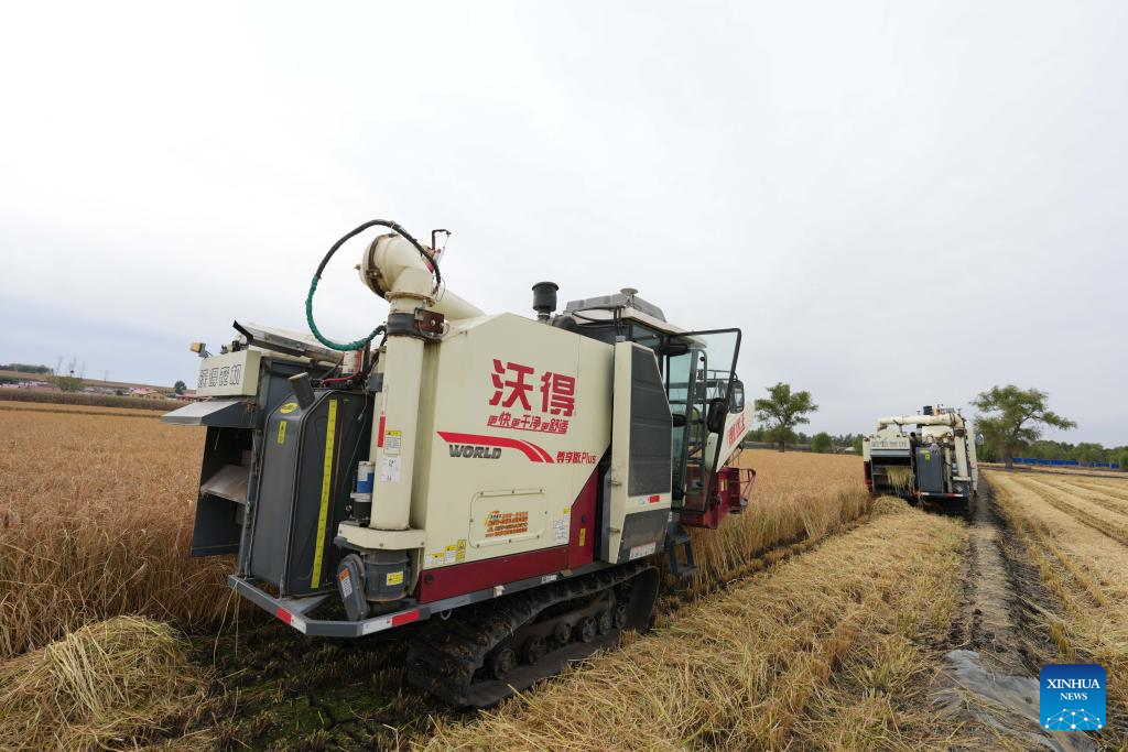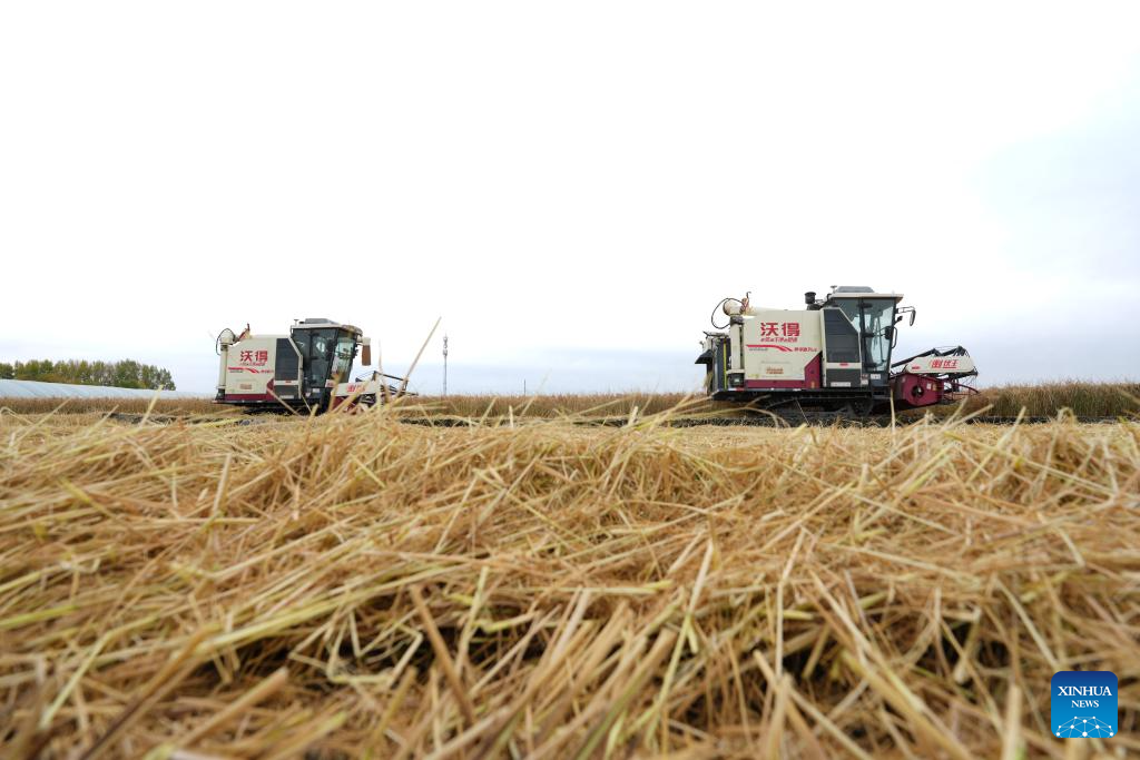 Harvesters work in a field of Yanjiagang Farm Co., Ltd. of Beidahuang Group in Harbin, northeast China's Heilongjiang Province, Oct. 11, 2025. China's "grain barn" Heilongjiang has entered the autumn harvest season. As of Oct. 10, Beidahuang Group has harvested 39.6903 million mu (2.65 million hectares), accounting for 84.86 percent of its total. (Xinhua/Wang Song)