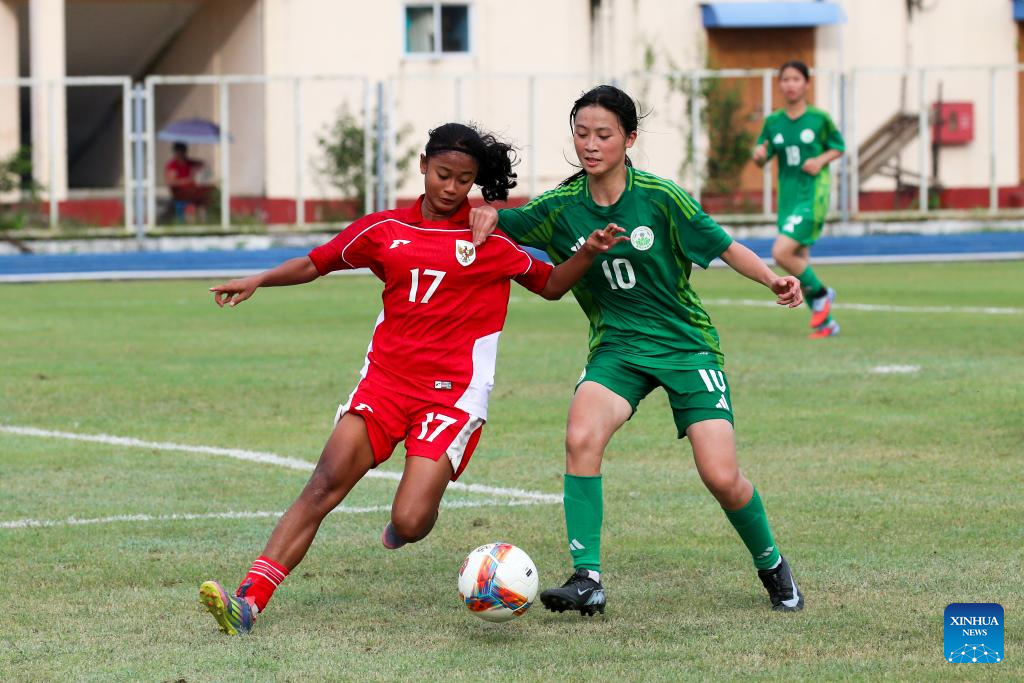 Shifana Rizka Nadhifa of Indonesia (L) vies with Lok Sam Io of China's Macao during the AFC U17 Women's Asian Cup 2026 China 2026 qualifier between China's Macao and Indonesia in Yangon, Myanmar, Oct. 13, 2025. (Xinhua/Myo Kyaw Soe)