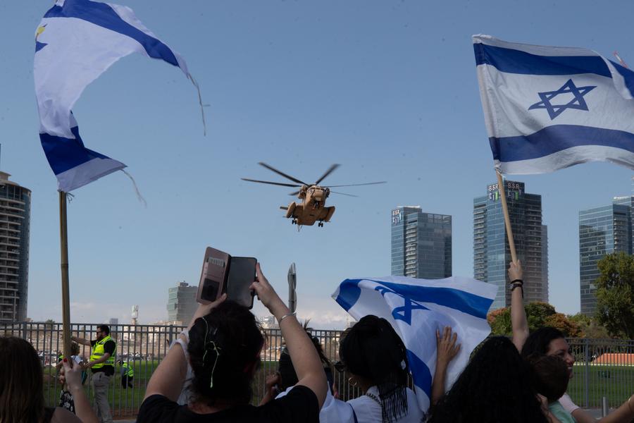 People celebrate as the helicopter carrying released hostages arrives at a hospital in Petah Tikva, Israel, Oct. 13, 2025. (Xinhua/Chen Junqing)