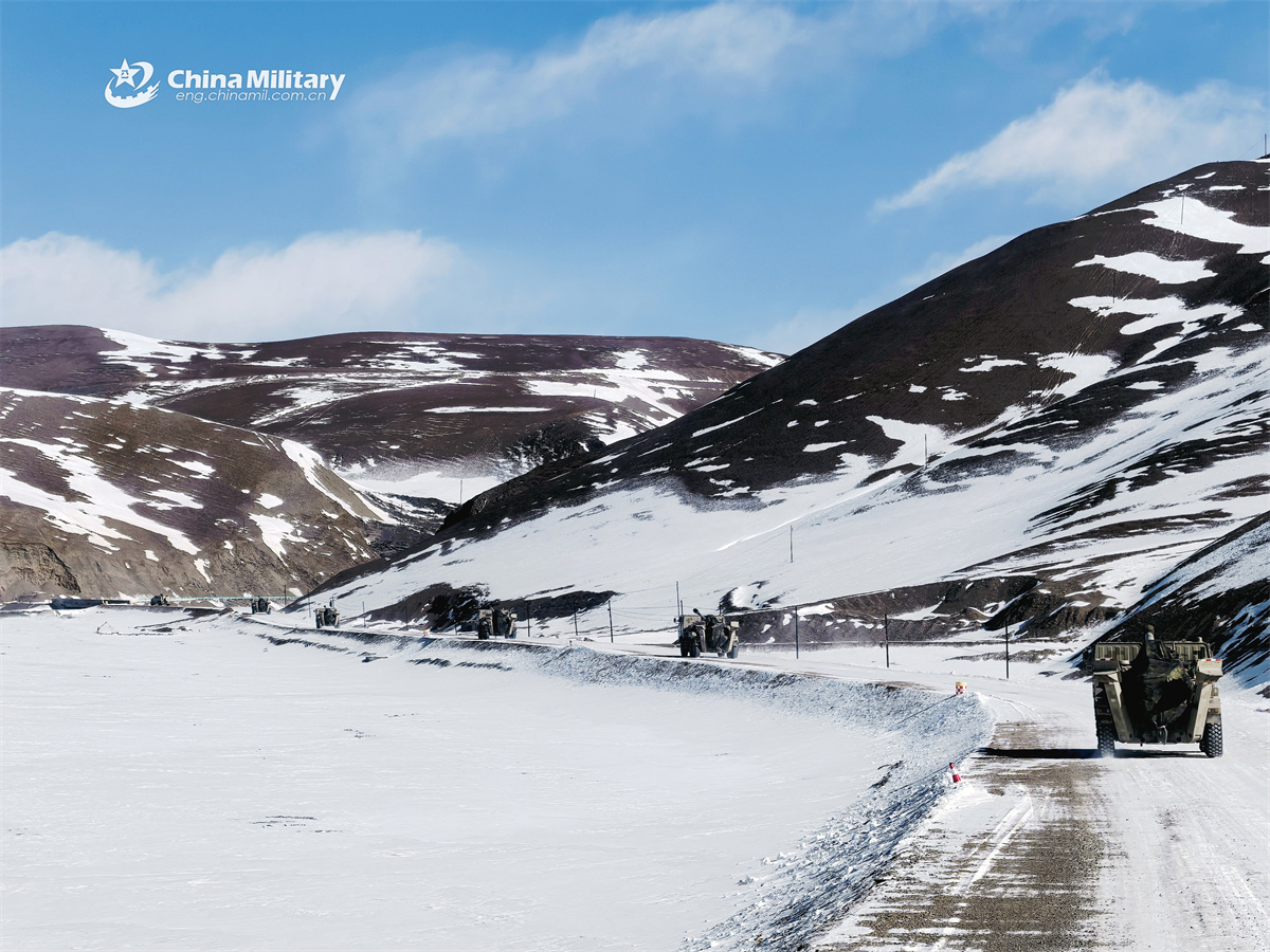 A convoy of wheeled-mounted equipment attached to a unit under the Chinese PLA Xinjiang Military Command maneuvers towards the firing position on snow-covered plateau during a maneuver training exercise in late September, 2025. (eng.chinamil.com.cn/Photo by Sun Jingyang and Li Yuxi)