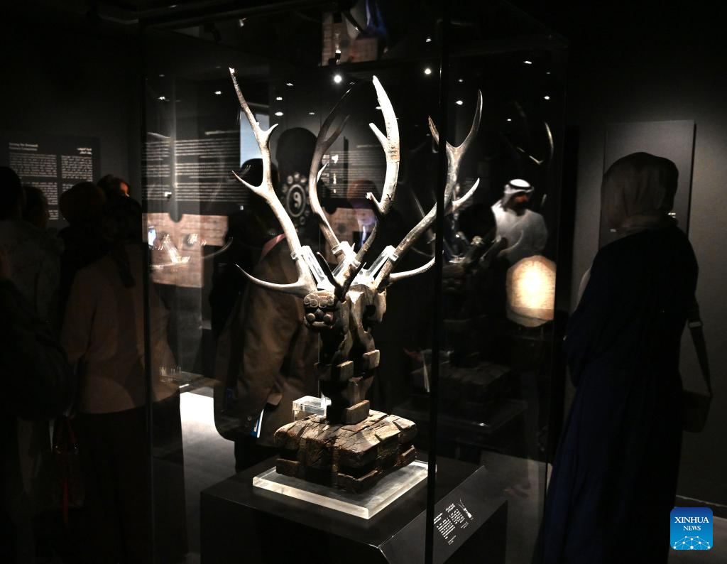 People visit the exhibition in Kuwait City, Kuwait, Oct. 15, 2025. The Chinese art exhibition "Distant and Close" opened on Wednesday at Kuwait's Dar al-Athar al-Islamiyyah, or House of Islamic Antiquities, a major public museum in Kuwait City. The exhibition, running through 2026, showcases the historical and cultural ties between China and Kuwait. (Photo by Asad/Xinhua)
