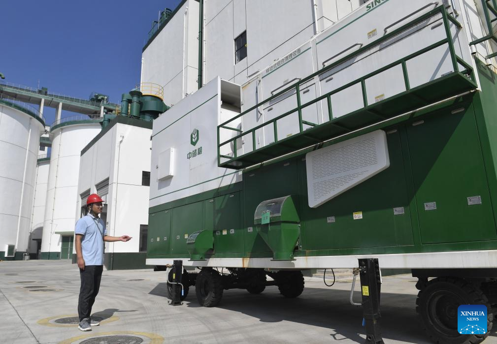 A technician introduces a mobile grain cleansing complex at a branch company of China Grain Reserves Group (Sinograin) in Chengdu, southwest China's Sichuan Province, Oct. 15, 2025.