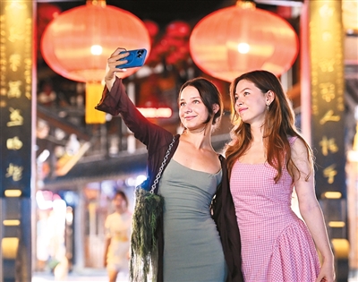 Tourists from Russia take a selfie at Ciqikou ancient town, Shapingba district, southwest China's Chongqing Municipality. (Photo/Sun Kaifang)