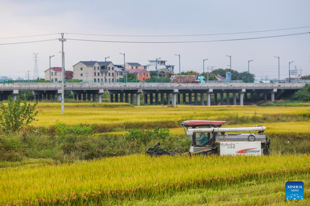 A reaper harvests paddy rice at a high-quality farmland demonstration area in Tangya Town of Jindong District, Jinhua City in east China's Zhejiang Province, on Oct. 22, 2025. (Xinhua/Xu Yu)