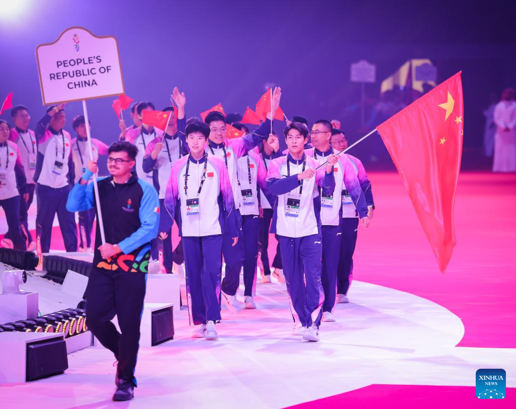 Members of the delegation of China parade during the opening ceremony of the 3rd Asian Youth Games at Exhibition World Bahrain in Sakhir, Bahrain, Oct. 22, 2025. (Bahrain Asian Youth Games Organizing Committee/Handout via Xinhua)