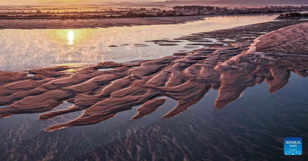An aerial drone photo taken on Oct. 24, 2025 shows the Wusuli River in the morning light in Raohe County, northeast China's Heilongjiang Province. (Photo by Sheng Jingli/Xinhua)