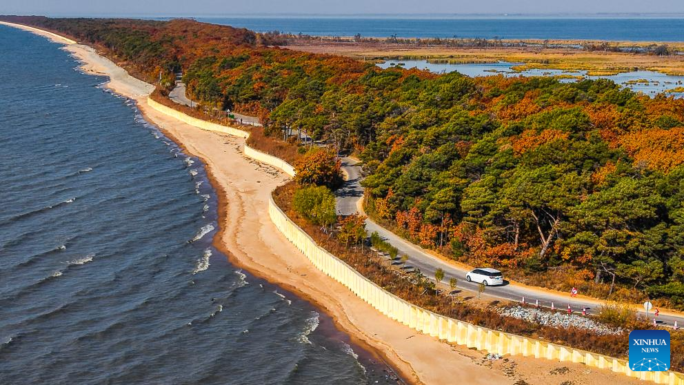 An aerial drone photo taken on Oct. 24, 2025 shows the autumn scenery of the Xingkai Lake in Mishan City, northeast China's Heilongjiang Province. (Photo by Huang Yongxing/Xinhua)
