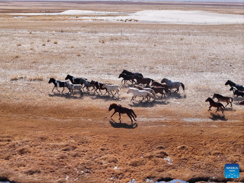 An aerial drone photo taken on Oct. 23, 2025 shows horses galloping on a grassland in the Kazak Autonomous County of Aksay, northwest China's Gansu Province. (Photo by Gao Hongshan/Xinhua)
