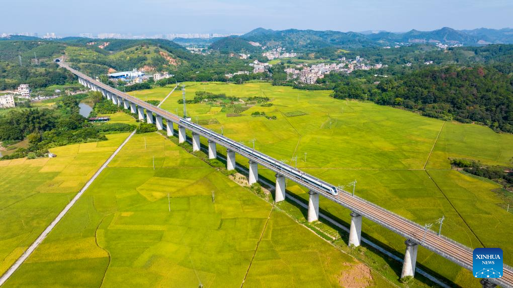 An aerial drone photo taken on Oct. 24, 2025 shows a high-speed train passing through rice fields in Longxu District of Wuzhou City, south China's Guangxi Zhuang Autonomous Region. (Photo by He Huawen/Xinhua)