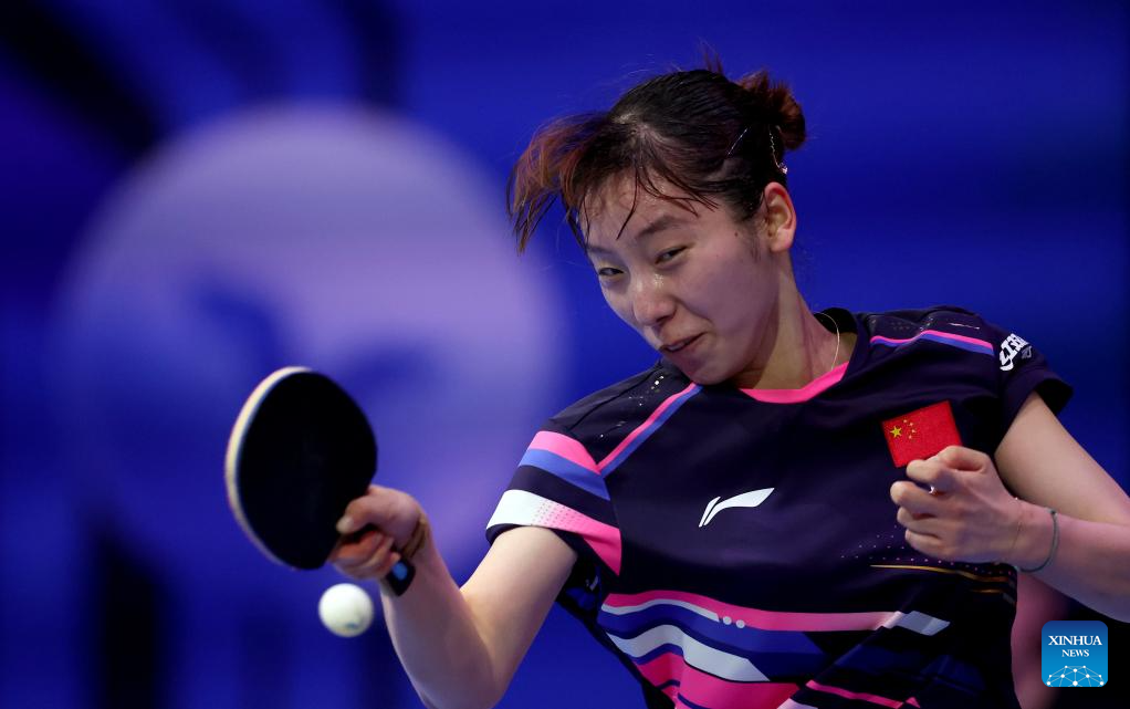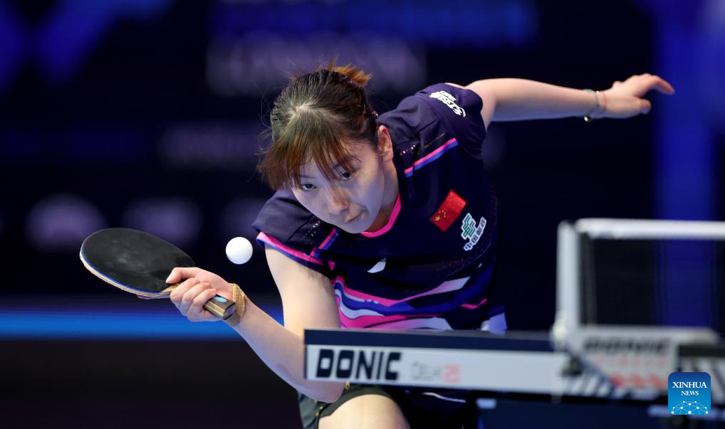 Yang Yiyun returns a shot during women's singles quarterfinal between Yang Yiyun of China and Harimoto Miwa of Japan in the WTT Star Contender London 2025 in London, Britain, on Oct. 25, 2025. (Xinhua/Li Ying)