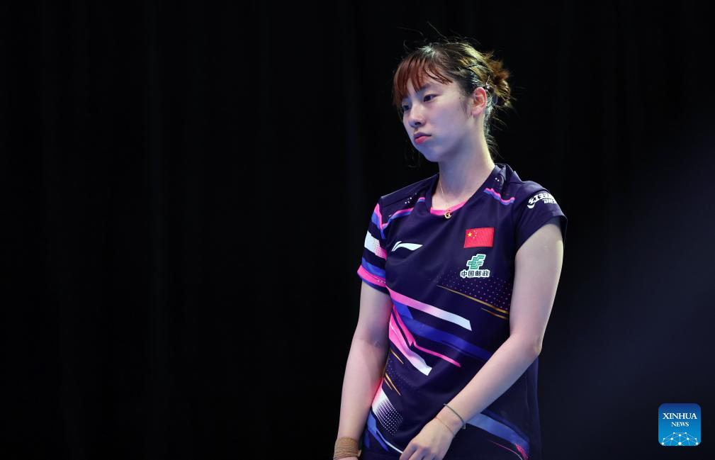 Yang Yiyun reacts during women's singles quarterfinal between Yang Yiyun of China and Harimoto Miwa of Japan in the WTT Star Contender London 2025 in London, Britain, on Oct. 25, 2025. (Xinhua/Li Ying)
