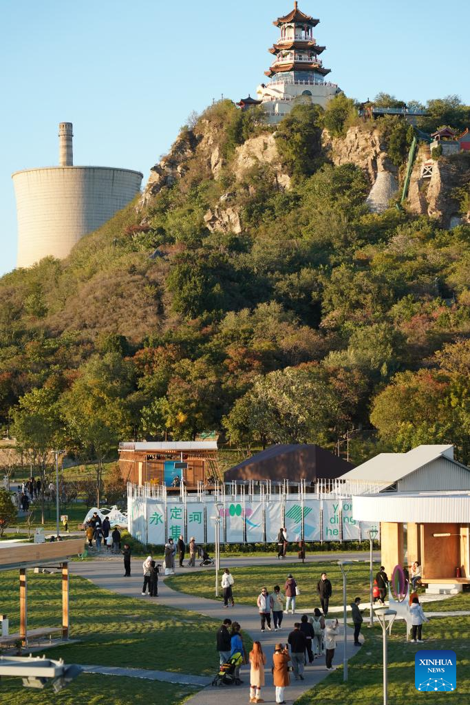 People enjoy the scenery along the Yongding River from a viewing platform in Shijingshan District of Beijing, capital of China, Oct. 26, 2025. (Xinhua/Zhang Chenlin)