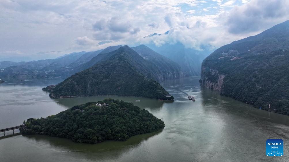 An aerial drone photo shows a view of Qutang Gorge, one of the Three Gorges on the Yangtze River, in Fengjie County, southwest China's Chongqing Municipality, Oct. 27, 2025. Fengjie, a county in Chongqing where the Kuimen gateway to the magnificent gorges of the Yangtze River is located, gained its reputation as the "city of poetry," as poets, military figures and politicians in history wrote extensively about the forbidding landscape of rapid currents and narrow waterways.