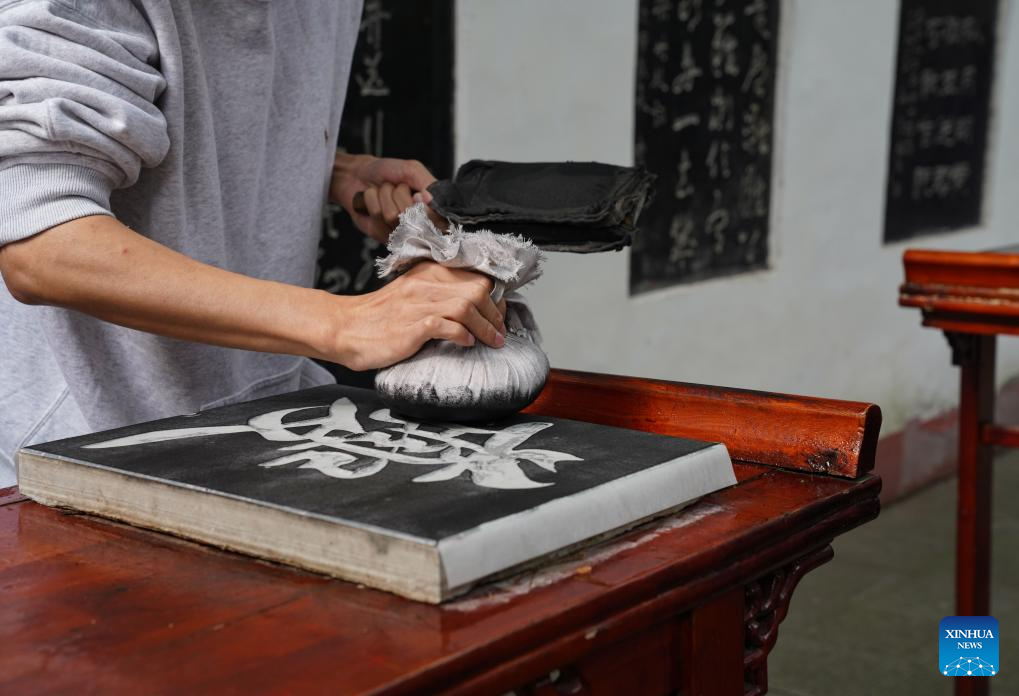 A tourist experiences rubbing techniques at the ancient town of Baidi in Fengjie County, southwest China's Chongqing Municipality, Oct. 27, 2025. Fengjie, a county in Chongqing where the Kuimen gateway to the magnificent gorges of the Yangtze River is located, gained its reputation as the "city of poetry," as poets, military figures and politicians in history wrote extensively about the forbidding landscape of rapid currents and narrow waterways.