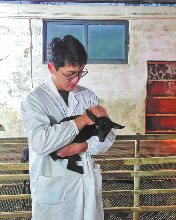 A researcher carries the world's first gene-edited black goat at Guangdong Ocean University in Zhanjiang, Guangdong province. [Photo provided to CHINA DAILY]