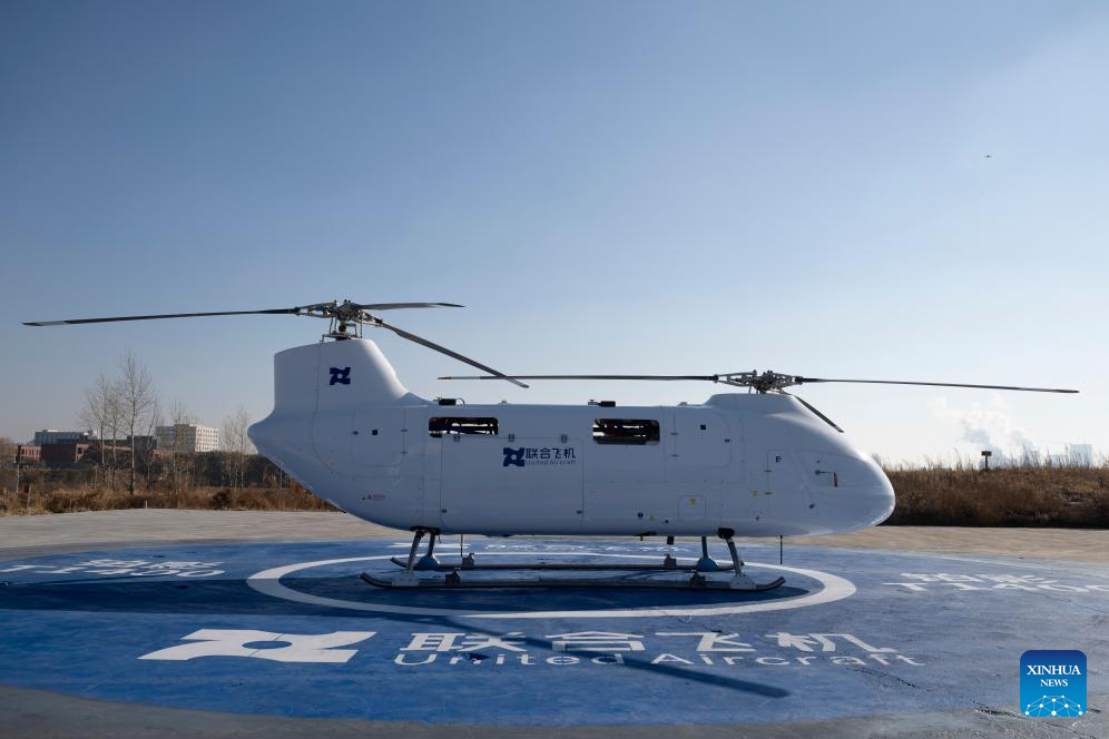 This photo taken on Oct. 30, 2025 shows the maiden flight ceremony of Boying T1400 Tandem Rotor Unmanned Helicopter of United Aircraft in Harbin, northeast China's Heilongjiang Province. The helicopter successfully completed its maiden flight here on Thursday. It has a maximum takeoff weight of 1,400 kilograms, an endurance of up to eight hours, a service ceiling of 6,500 meters, and a maximum horizontal flight speed of 180 kilometers per hour.