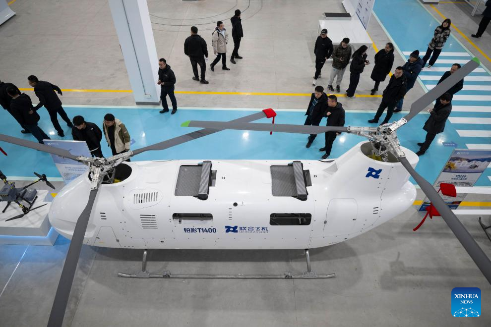 Guests visit the Boying T1400 Tandem Rotor Unmanned Helicopter at the factory of United Aircraft in Harbin, northeast China's Heilongjiang Province, Oct. 30, 2025. The helicopter successfully completed its maiden flight here on Thursday. It has a maximum takeoff weight of 1,400 kilograms, an endurance of up to eight hours, a service ceiling of 6,500 meters, and a maximum horizontal flight speed of 180 kilometers per hour.