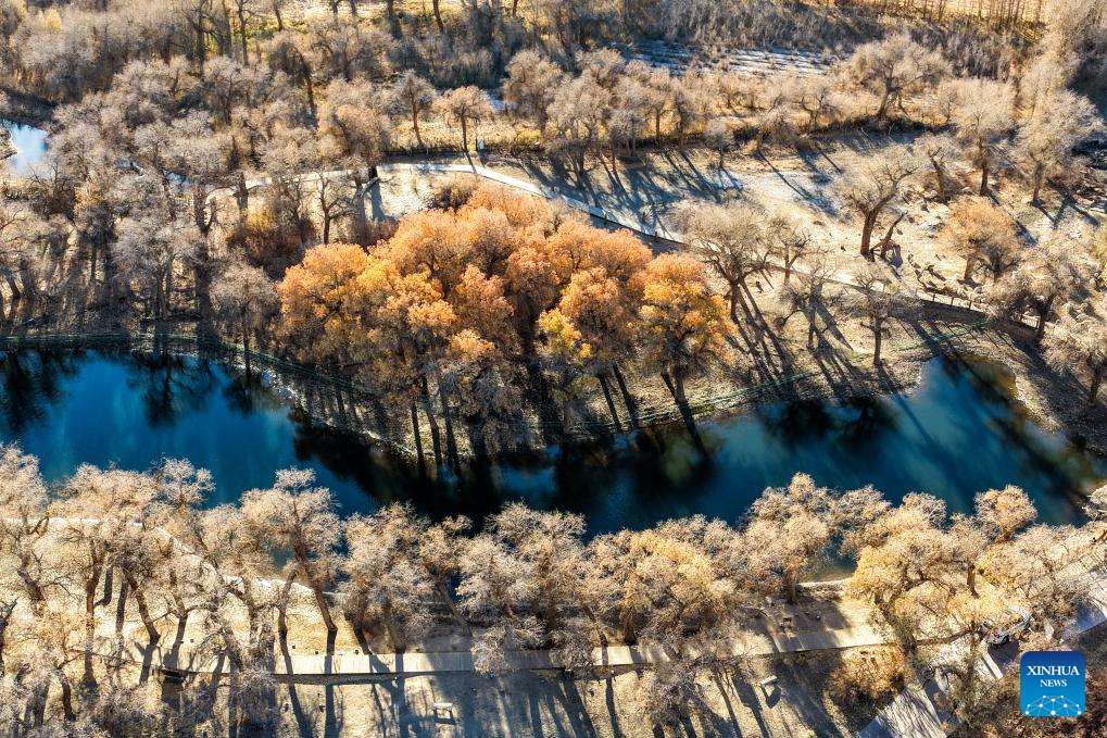 An aerial drone photo taken on Oct. 30, 2025 shows the scenery of a populus euphratica forest in Ejina Banner, north China's Inner Mongolia Autonomous Region. (Xinhua/Lian Zhen)