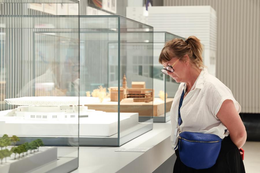A woman visits an exhibition at Shenzhen Bay Culture Square in Shenzhen, south China's Guangdong Province, Nov. 1, 2025. (Xinhua/Liang Xu)