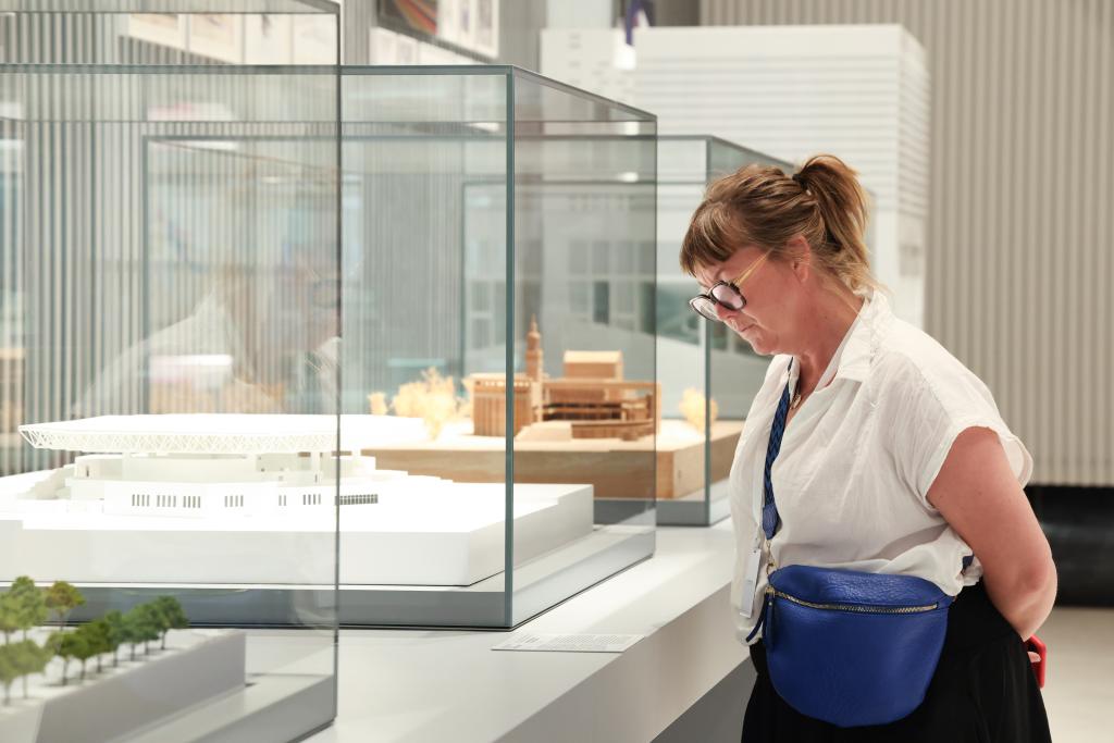 A woman visits an exhibition at Shenzhen Bay Culture Square in Shenzhen, south China's Guangdong Province, Nov. 1, 2025. The Shenzhen Bay Culture Square began trial operation on Saturday. The landmark square, with a construction area of 188,000 square meters, has nine exhibition halls. (Xinhua/Liang Xu)