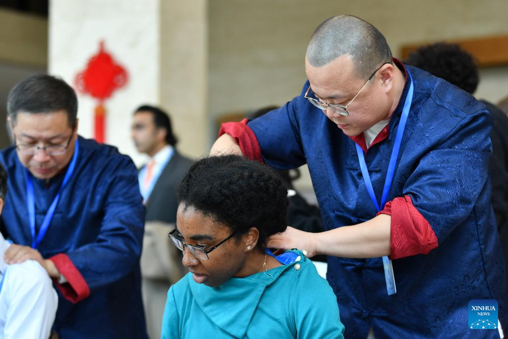 A participant tries Traditional Chinese Medicine (TCM) massage during the cultural event "TCM Connects the World, Ginseng Perfumes Chongyang -- Art and Tradition of Chinese Medicine" at the Palais des Nations in Geneva, Switzerland, Oct. 29, 2025. The event featured demonstrations of Traditional Chinese Medicine (TCM) exercises, ginseng tasting, herbal sachet making, and wellness activities, offering participants an opportunity to learn about the health philosophy behind TCM. (Xinhua/Lian Yi)