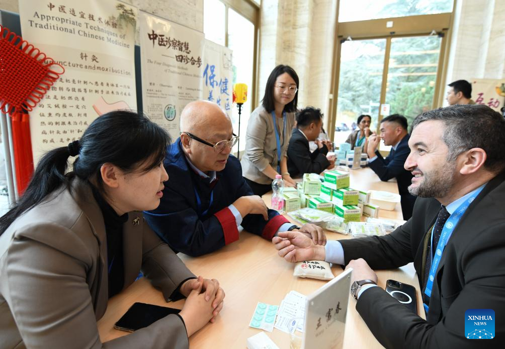 A participant consults a Traditional Chinese Medicine doctor during the cultural event "TCM Connects the World, Ginseng Perfumes Chongyang -- Art and Tradition of Chinese Medicine" at the Palais des Nations in Geneva, Switzerland, Oct. 29, 2025. The event featured demonstrations of Traditional Chinese Medicine (TCM) exercises, ginseng tasting, herbal sachet making, and wellness activities, offering participants an opportunity to learn about the health philosophy behind TCM. (Xinhua/Lian Yi)