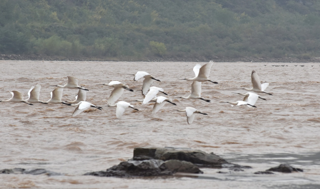 Eurasian spoonbills fly over the Hukou Waterfall along the Yellow River in Linfen, north China's Shanxi province. (Photo/Lyu Guiming)
