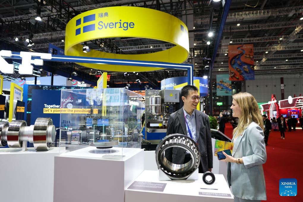 People talk at the Sweden Pavilion during the eighth China International Import Expo (CIIE) in east China's Shanghai, Nov. 5, 2025. The eighth CIIE opened here on Wednesday. Thailand, the United Arab Emirates, Nigeria, Georgia, Sweden and Colombia serve as the guest countries of honor at this year's CIIE. (Xinhua/Wang Zecong)