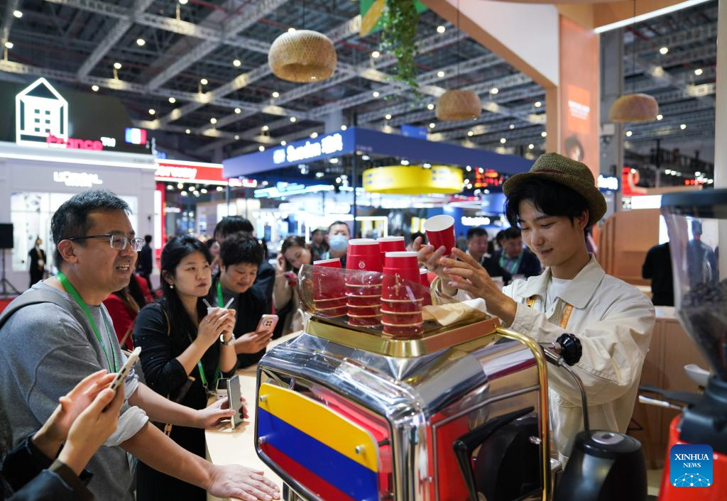People taste coffee at the Colombia Pavilion during the eighth China International Import Expo (CIIE) in east China's Shanghai, Nov. 5, 2025. The eighth CIIE opened here on Wednesday. Thailand, the United Arab Emirates, Nigeria, Georgia, Sweden and Colombia serve as the guest countries of honor at this year's CIIE. (Xinhua/Fan Yuqing)