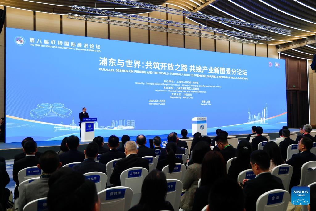 A sub-forum titled "Pudong and the World: Forging a Path to Openness, Shaping a New Industrial Landscape" is held during the 8th Hongqiao International Economic Forum at the National Exhibition and Convention Center (Shanghai) in Shanghai, east China, Nov. 6, 2025. (Xinhua/Liu Jiaqi)