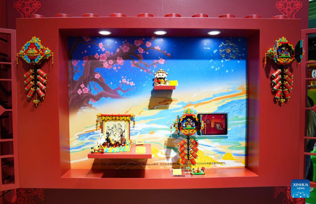 The LEGO bricks for the Chinese Lunar Year of the Horse, which made their global debut, are displayed at the Consumer Goods exhibition area during the 8th China International Import Expo (CIIE) in east China's Shanghai, Nov. 6, 2025. Many exhibitors debuted their latest products at the 8th CIIE in Shanghai. (Xinhua/Du Xinyi)