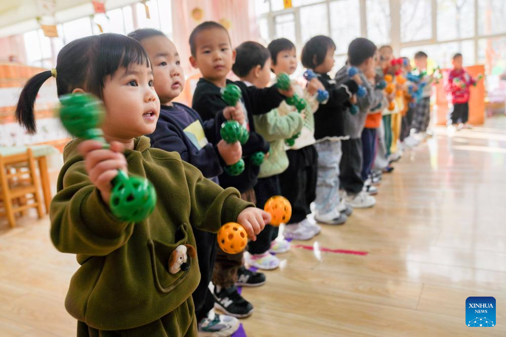 Children of a nursery class exercise at a kindergarten in Zouping City, east China's Shandong Province, Nov. 6, 2025. Shandong Province has rolled out a series of policies such as developing childcare institutions, increasing kindergarten nursery classes, and offering childcare service in communities to promote its inclusive childcare system, with a focus on the caring of children under three years old. (Photo by Dong Naide/Xinhua)